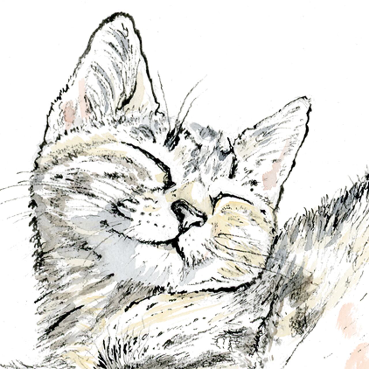 葦ペン画で描いた背伸びする猫のプリント画。B5サイズの水彩紙にプリントしたものです。 気持ちよさそうに背伸びする子猫の表情に心癒される作品になっています。